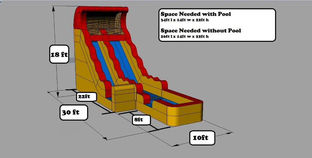The space required is 18ft W x 35ft L x 20ft H of clearance for this slide. It's actual size is 16ft W x 30ft L x 18ft H. Safety Information: Due to this unit being a non-airbed landing, we do not recommend putting it on concrete.