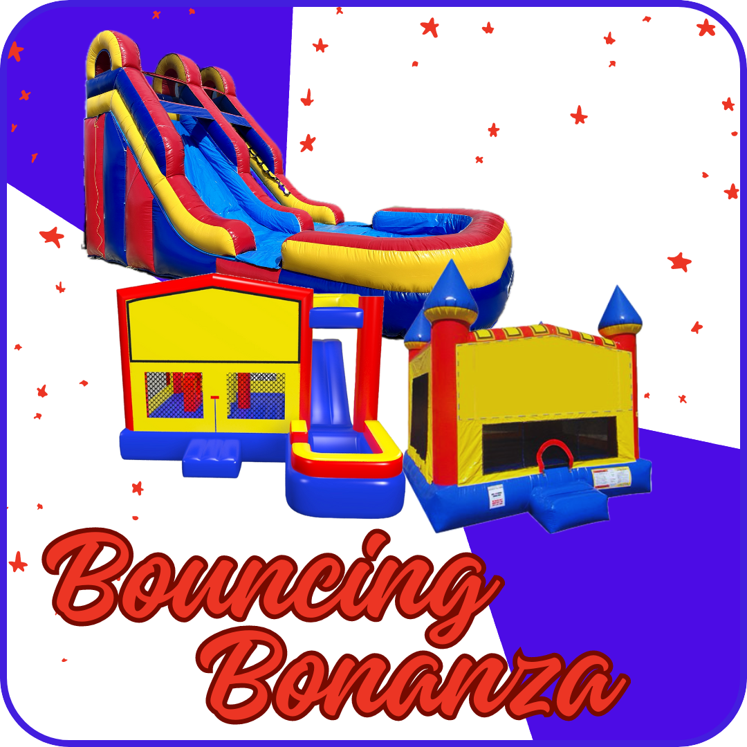 Get ready for the ultimate thrill as we transform your ordinary day into a gravity-defying Bonanza! Our Bouncing Bonanza package is designed for all ages! Bring the whole family for a day of boundless laughter and connection. For convenience, this package includes a 13x13 bounce house, 7 in 1 Space Saver and 16ft Slide. Due to high demand, ALL packages must be booked over the phone to guarantee availability Packages are subject to availability of each item. For further assistance, feel free to reach out to us at 805-955-9802