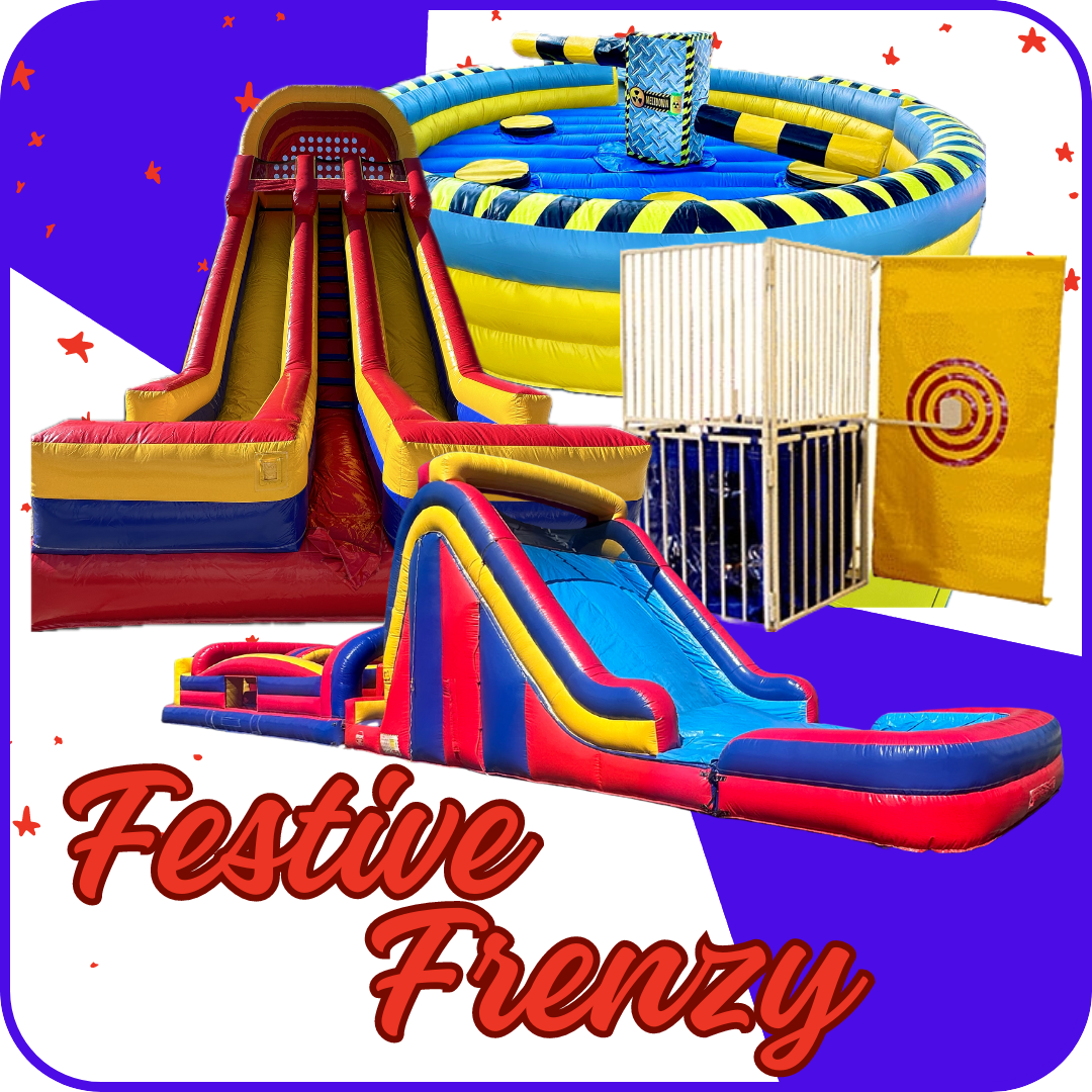 Step into the Spectacle: It's Festive Frenzy Time! Get ready for a whirlwind of excitement with our Festive Frenzy Package, creating an extravaganza like no other that promises to elevate your celebration to new heights! Thrill rides, stomach dropping slides, adventurous obstacle courses and a dunk tank to add some splash! For convenience, this package is customizable and includes one item from each of the four listed categories. Due to high demand, ALL packages must be booked over the phone to guarantee availability Packages are subject to availability of each item. For further assistance, feel free to reach out to us at 805-955-9802