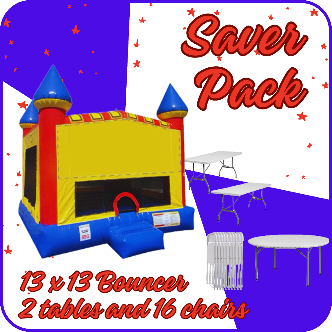 Includes: 13x13 Bouncer, 2 Tables and 16 Chairs. Excludes: All 13x13 Theme Bouncers |