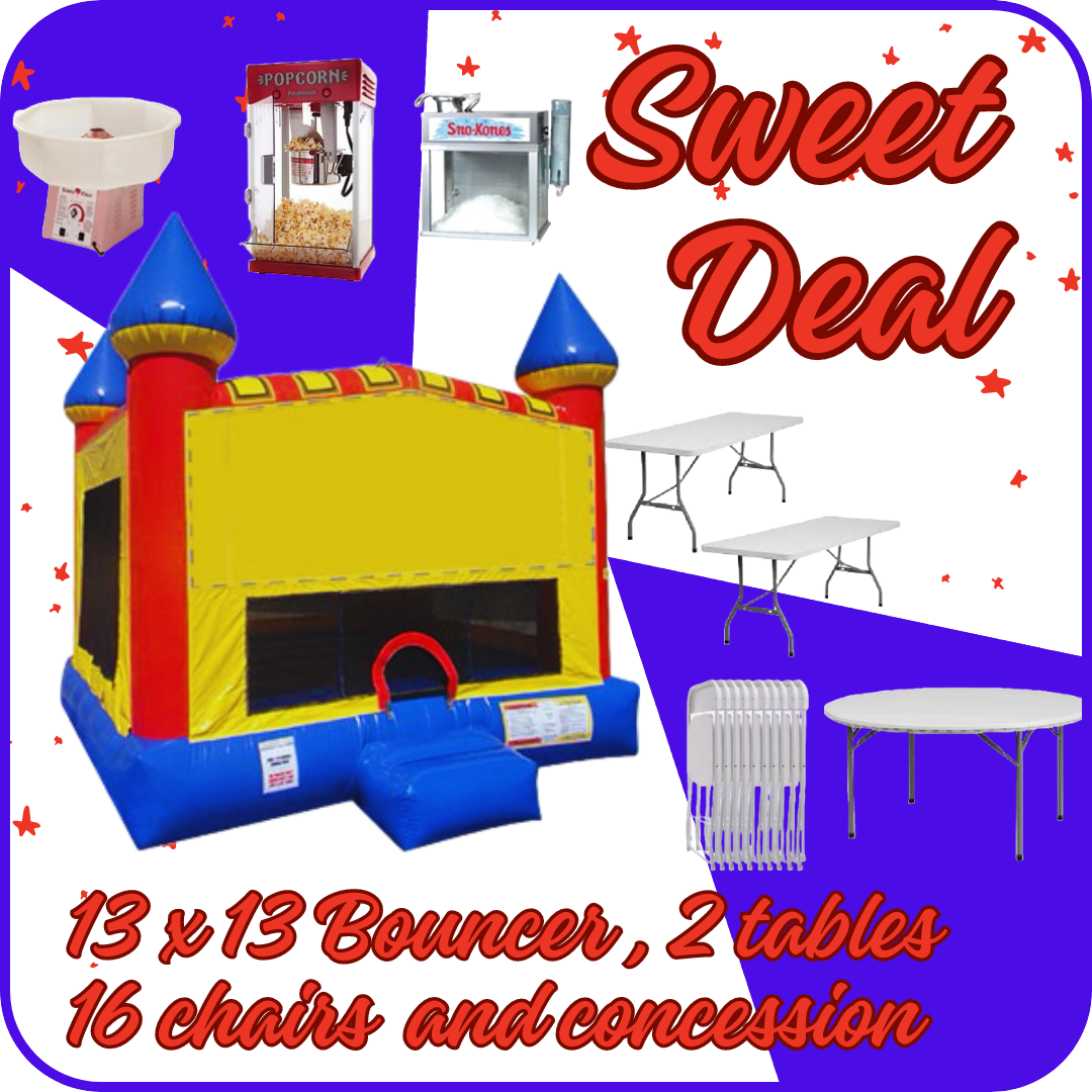 Includes: 13x13 Bouncer, 2 Tables and 16 Chairs and concession item. Excludes: All 13x13 Theme Bouncers and Margarita Machine |